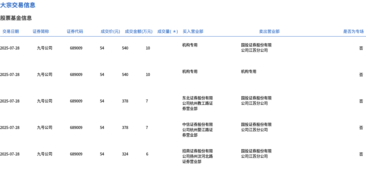 7月28日,九号公司大宗交易成交40万股,成交额2160万元,占当日总成交额的4.83%,成交价54元,较市场收盘价59.19元折价8.77%。