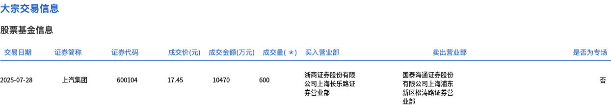 7月28日,上汽集团大宗交易成交600万股,成交额1.05亿元,占当日总成交额的9.48%,成交价17.45元,较市场收盘价17.59元折价0.8%。