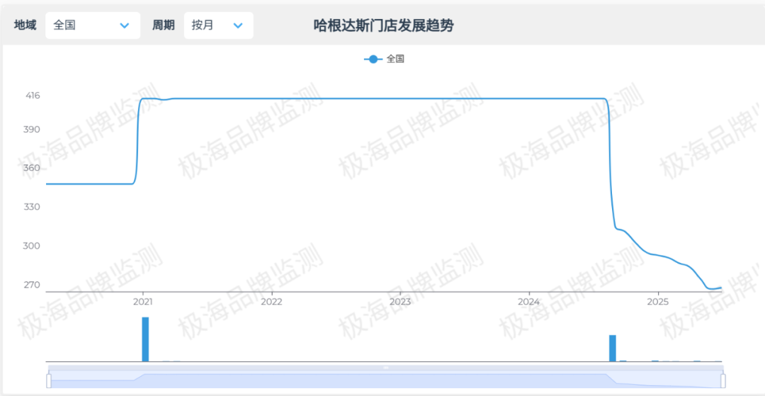 极海品牌监测显示,2024年开始,哈根达斯的门店规模呈断崖式收缩,目前仅剩不到270家门店,三、四线城市早已难觅其踪影。