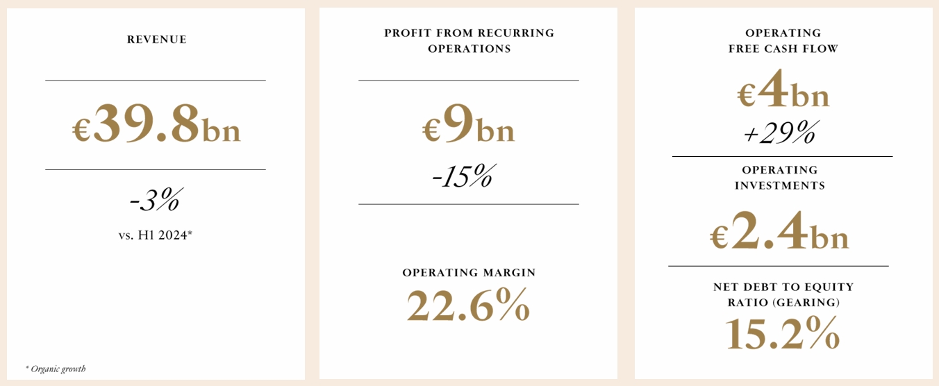7月24日,LVMH集团发布2025上半年财报,期内收入398亿欧元(约合人民币3353亿元),同比下降3%;经常性业务利润90亿欧元(约合人民币758亿元),同比下降15%;自由现金流40亿欧元(约合人民币336亿元),同比增长29%。