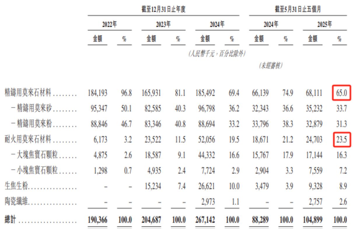 金岩高新的主要产品包括精铸用莫来石材料和耐火用莫来石材料,同时也销售生焦生粉,供客户进一步加工使用。从公司披露的数据来看,金岩高新精铸用莫来石材料的营收占比已经从2022年的96.8%下滑至2025年前5个月的65%。同时,耐火用莫来石材料的营收占比从2022年的3.2%上升至2025年前5个月的23.5%。