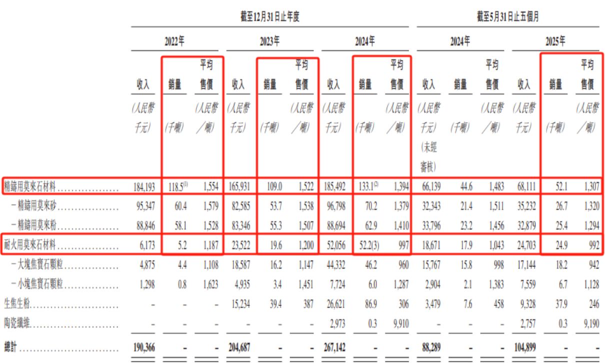 申请文件显示,2022年至2025年前5个月,金岩高新精铸用莫来石材料的平均售价从1554元/吨跌至1307元/吨,呈持续下滑趋势,期间累计降幅达15.9%。2023年,金岩高新精铸用莫来石材料的销售量下滑8.02%至10.9万吨,在该年出现了“量价齐跌”的情形。