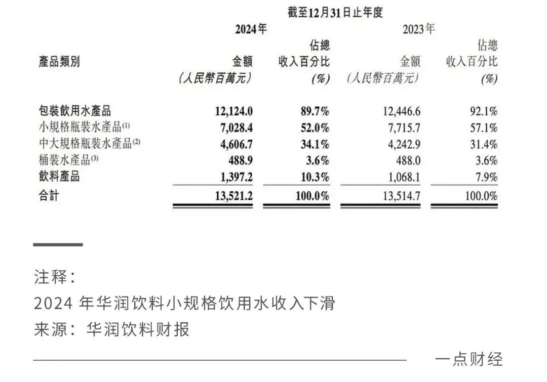 其中,华润饮料拥有“佐味茶事”无糖茶、“至本清润”草本饮料等品牌,但2024年饮料收入仅13.97亿元,收入占比仅10.3%,难掩“水强饮弱”的失衡。