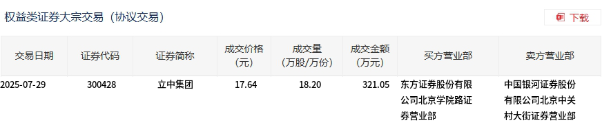 7月29日,立中集团大宗交易成交18.2万股,成交额321.05万元,占当日总成交额的2.57%,成交价17.64元,较市场收盘价18.76元折价5.97%。