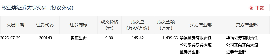 7月29日,盈康生命大宗交易成交145.42万股,成交额1439.66万元,占当日总成交额的12.87%,成交价9.9元,较市场收盘价10.13元折价2.27%。