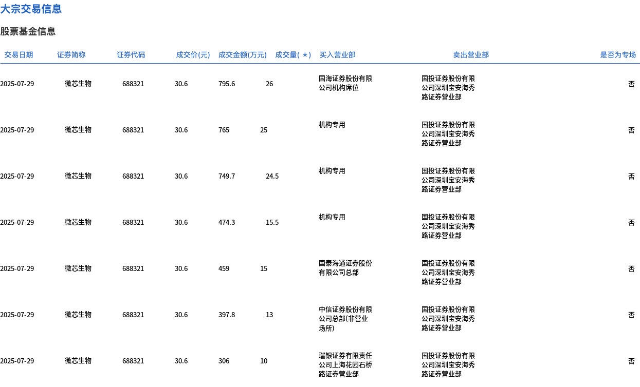 7月29日,微芯生物大宗交易成交189.94万股,成交额5812.16万元,占当日总成交额的3.75%,成交价30.6元,较市场收盘价38.37元折价20.25%。