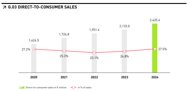 2024年,彪马批发业务按汇率调整后微增0.4%至63.92亿欧元,DTC业务增长16.6%至24.25亿欧元,相当于总销售额的27.5%,上一财年为24.8%。经汇率调整后,彪马自有全价门店和工厂直销点的销售额在2024年增长14.2%。