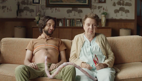 最近彩虹糖(Skittles)就推出了一支充满话题性的母亲节广告。一个大龄巨婴和年老的母亲懒洋洋地坐在沙发上,两人之间还留着一根肉色的粗脐带——母亲吃着彩虹糖,而巨婴通过脐带猜出彩虹糖的口味。