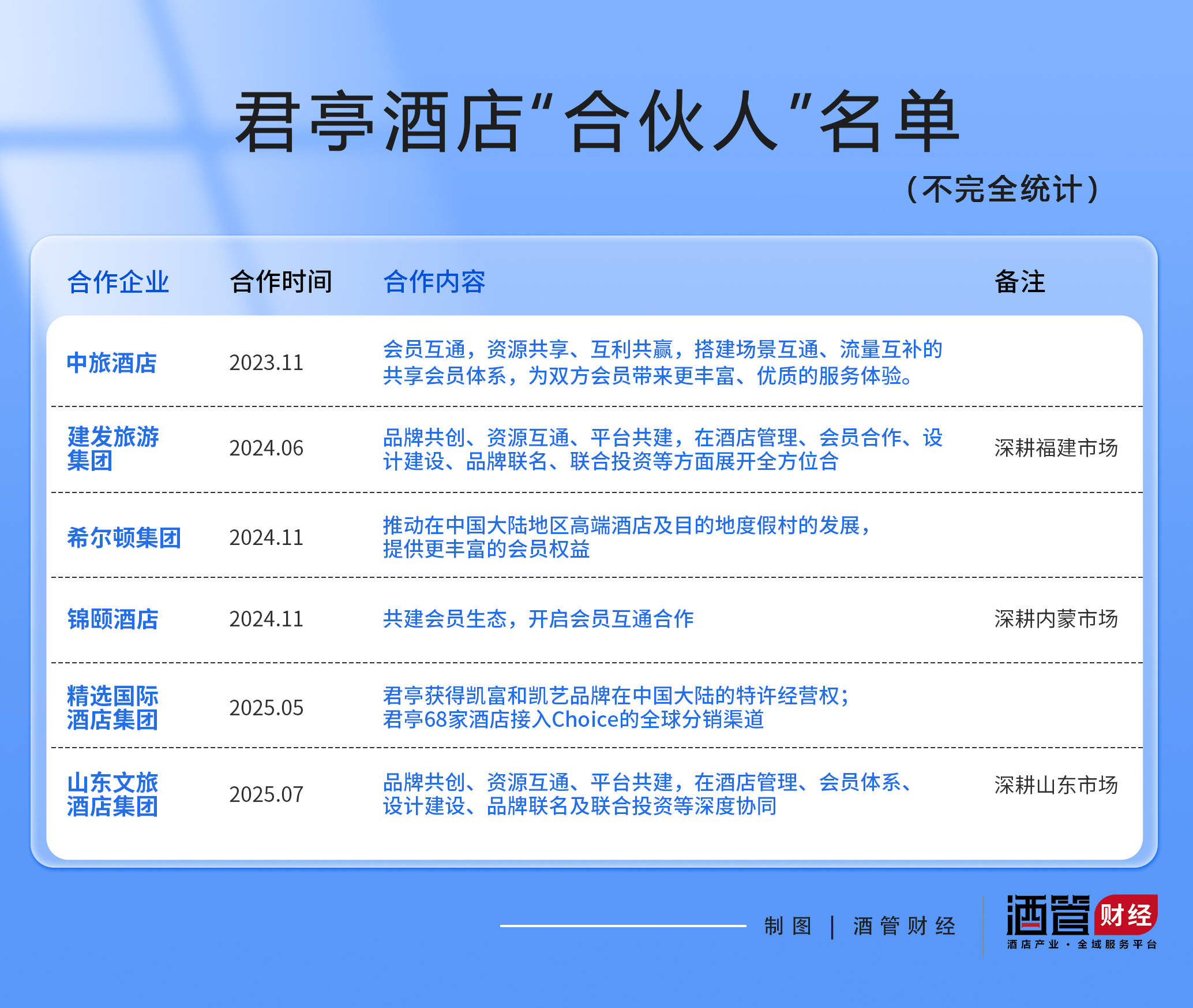 这包括但不限于品牌共建(君亭与建发、希尔顿等)、联合开发以及独家特许经营(君亭酒店集团与精选国际酒店集团)等。