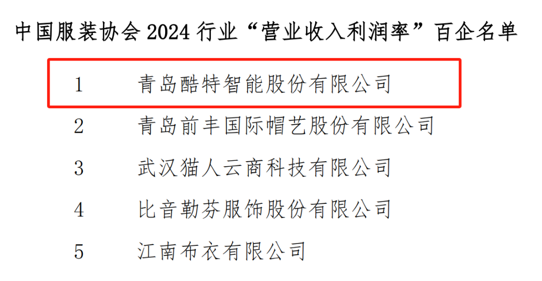 7月23日,中国服装协会“2024行业百企发布”名单正式揭晓,名单分别从“营业收入”“利润总额”“营业收入利润率”三个维度进行评选。此次,酷特智能成功入选三个榜单,收获2024年度榜单“大满贯”,其中,酷特智能位列“营业收入利润率”榜单第一名,充分体现公司综合竞争实力。
