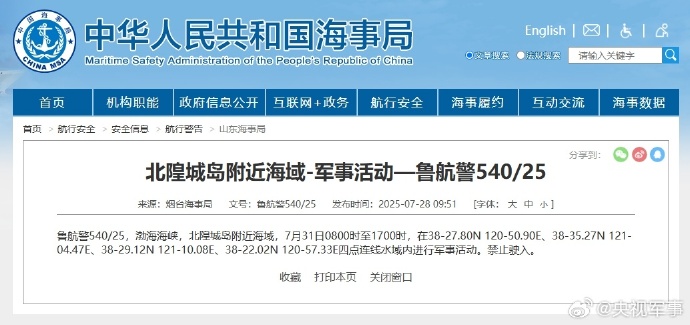 据中国海事局网站消息,烟台海事局发布航行警告,7月31日8时至17时,渤海海峡,北隍城岛附近海域进行军事活动,禁止驶入。