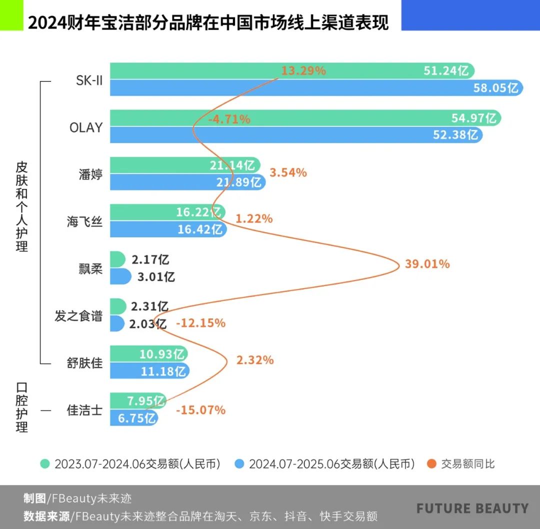 与此同时,海飞丝、潘婷、飘柔等三大核心洗护品牌均保持增长态势,《FBeauty未来迹》整合线上数据发现,飘柔品牌2025财年在线上交易额增长高达39.01%。