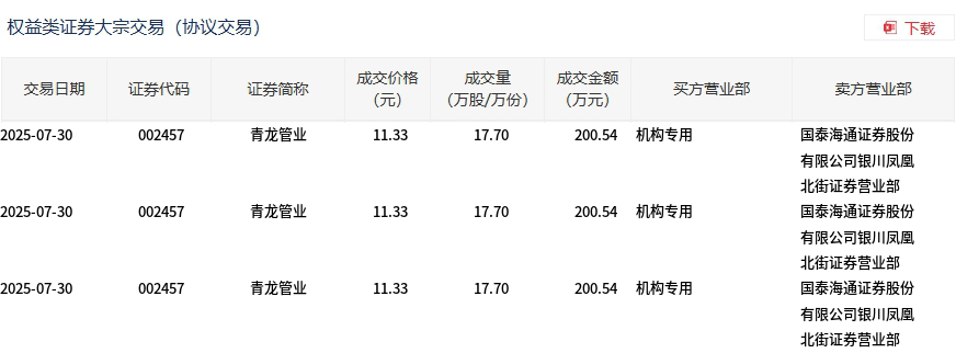 7月30日,青龙管业大宗交易成交53.1万股,成交额601.62万元,占当日总成交额的0.84%,成交价11.33元,较市场收盘价12.93元折价12.37%。