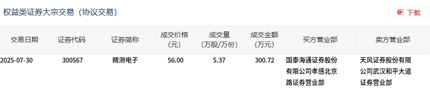 7月30日,精测电子大宗交易成交5.37万股,成交额300.72万元,占当日总成交额的0.76%,成交价56元,较市场收盘价59.88元折价6.48%。