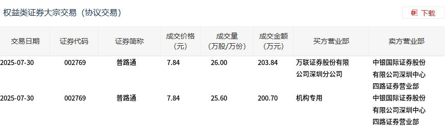 7月30日,普路通大宗交易成交51.6万股,成交额404.54万元,占当日总成交额的5.48%,成交价7.84元,较市场收盘价8.66元折价9.47%。