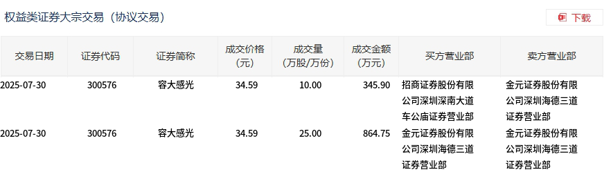 7月30日,容大感光大宗交易成交35万股,成交额1210.65万元,占当日总成交额的1.48%,成交价34.59元,较市场收盘价39.01元折价11.33%。