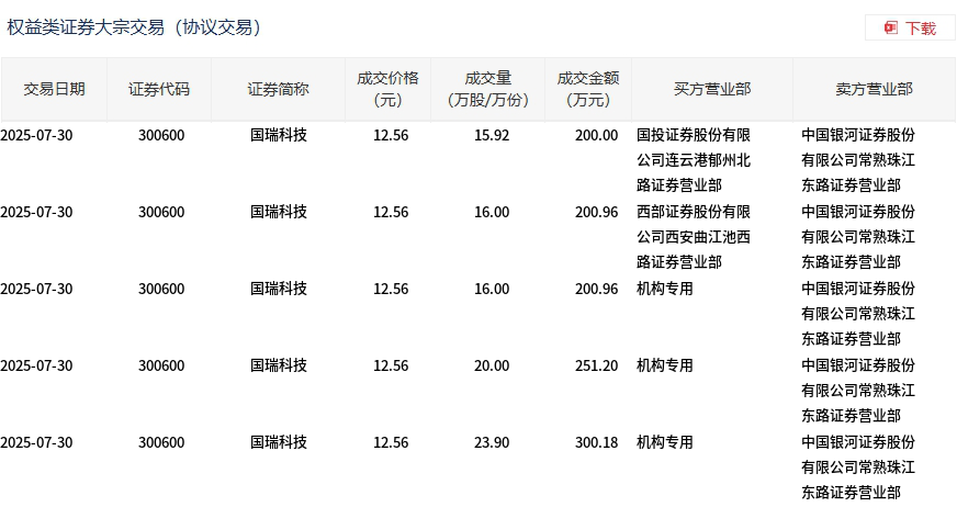 7月30日,国瑞科技大宗交易成交91.82万股,成交额1153.3万元,占当日总成交额的0.85%,成交价12.56元,较市场收盘价18.03元折价30.34%。