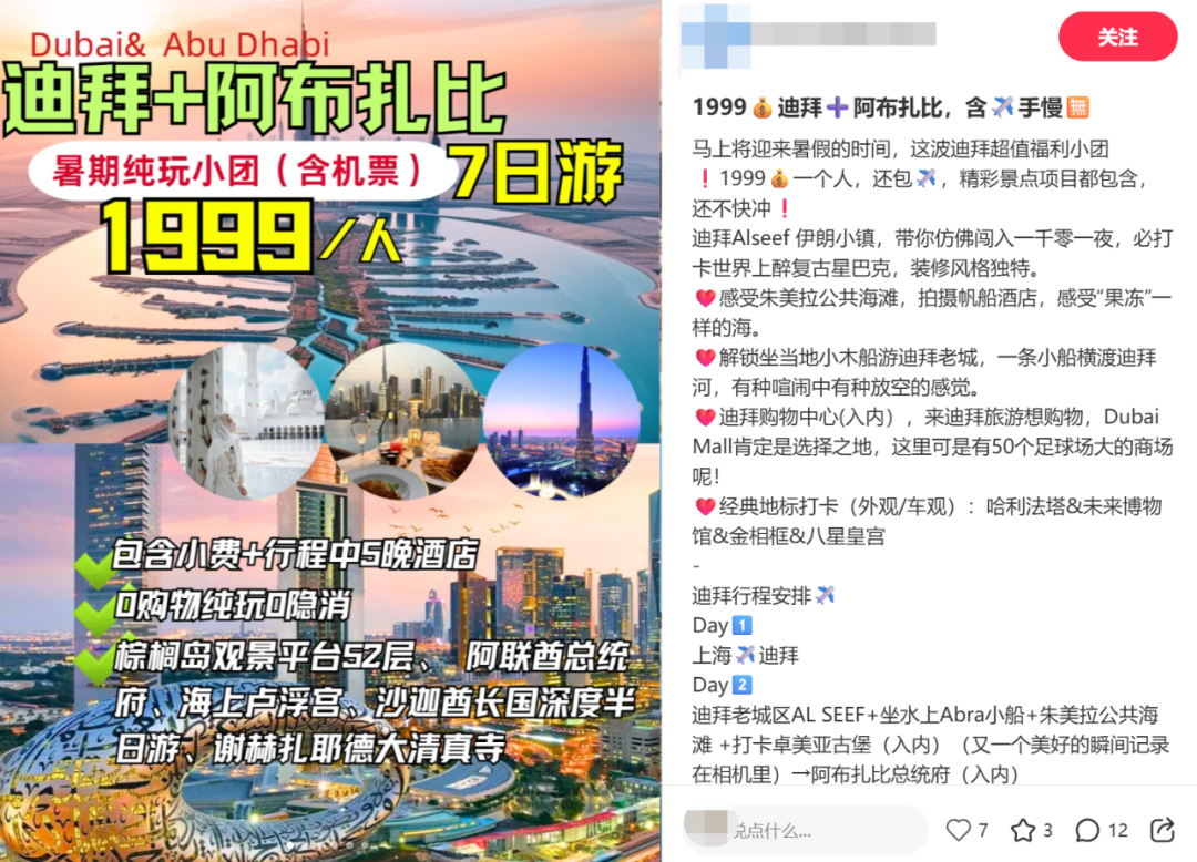 社交媒体上也是满满的迪拜低价游“种草”广告。