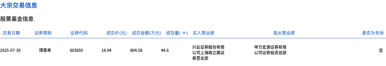 7月30日,璞泰来大宗交易成交44.6万股,成交额804.58万元,占当日总成交额的1.32%,成交价18.04元,较市场收盘价18.04元持平。
