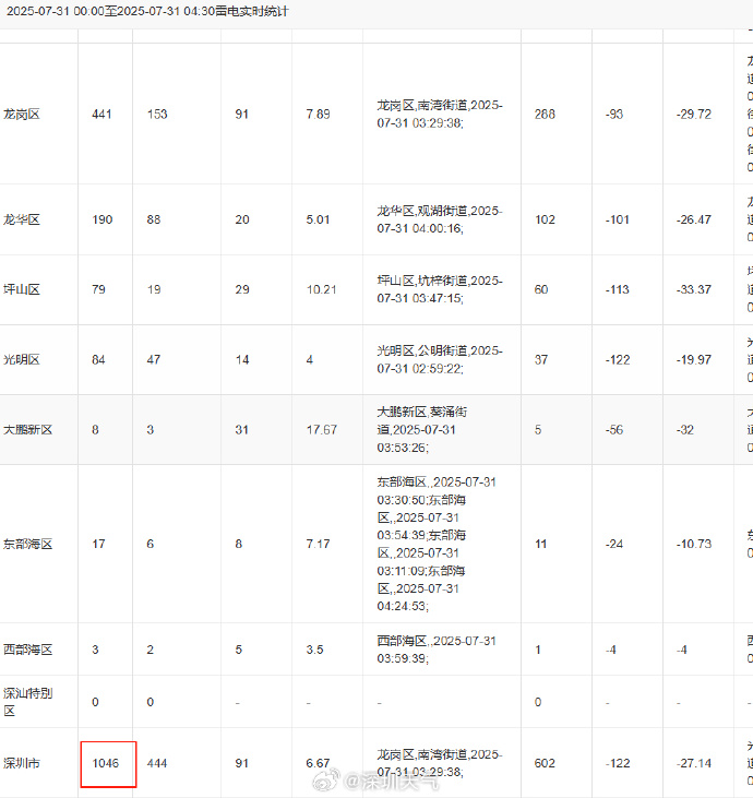 @深圳天气 微博7月31日消息,受本地生成并快速加强的强雷雨云团影响,今天凌晨至早晨深圳市出现局地暴雨到大暴雨,大暴雨出现在龙岗、龙华和光明,降雨具有“突发性强、局地性明显、短时雨强极大”的特点;全市平均雨量35.1毫米,最大累计雨量194.3毫米,最大2小时雨量168.1毫米和最大1小时雨量125.8毫米(排名今年第1、全市历史第5、龙岗历史第2),均出现在龙岗区平湖街道白泥坑站。7月31日00时-04时30分,全市共记录到1046次闪电。