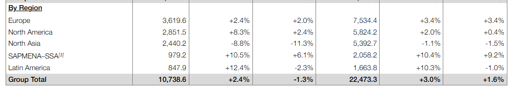 按地区来看,SAPMENA-SSA(南亚太、中东、北非、撒哈拉以南非洲)和拉丁美洲继续成高增长领跑地区,欧洲市场增长有所放缓,北亚虽然成为集团唯一业绩下滑地区(-1.1%),但如果去除旅游零售,实际略有增长。
