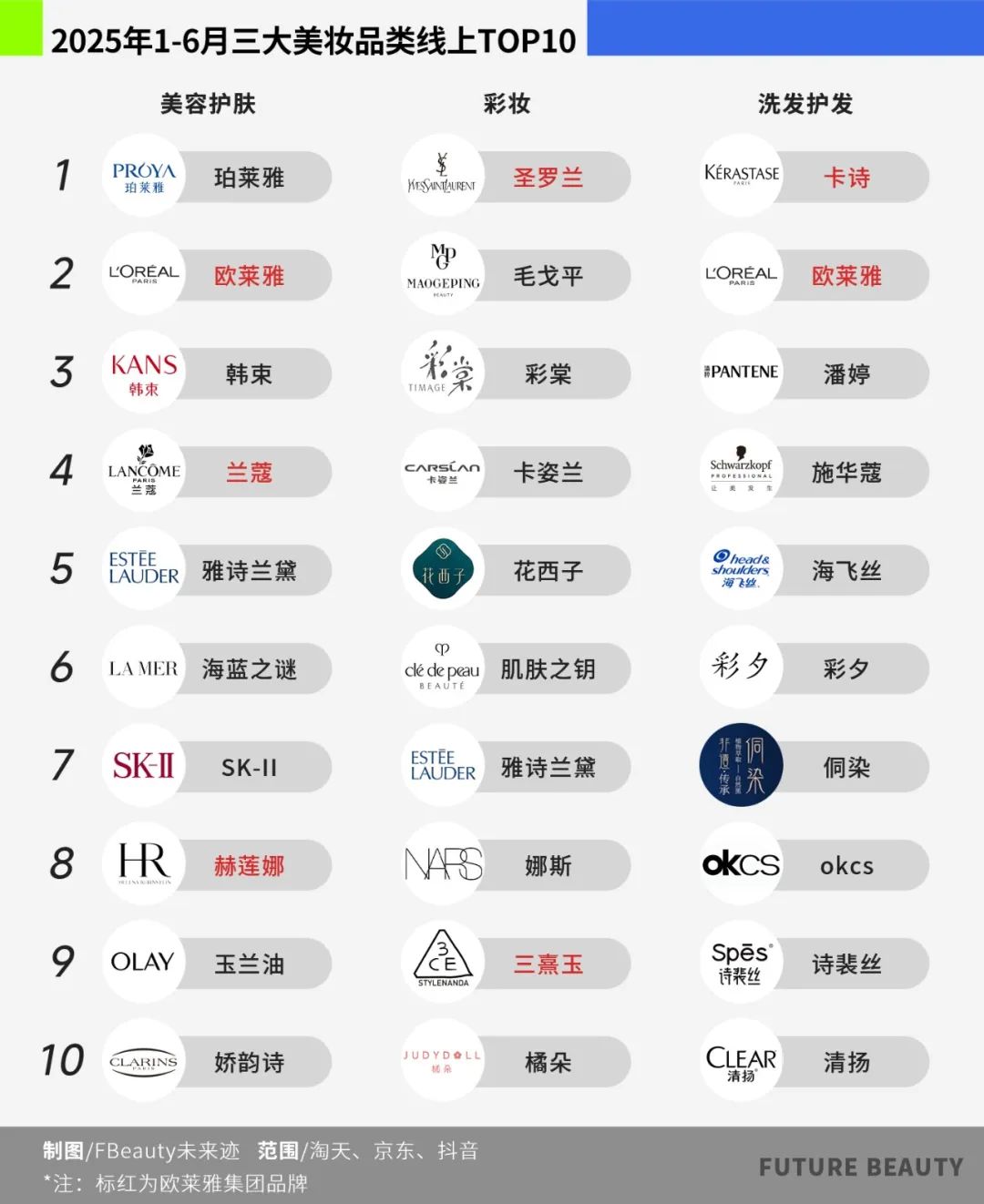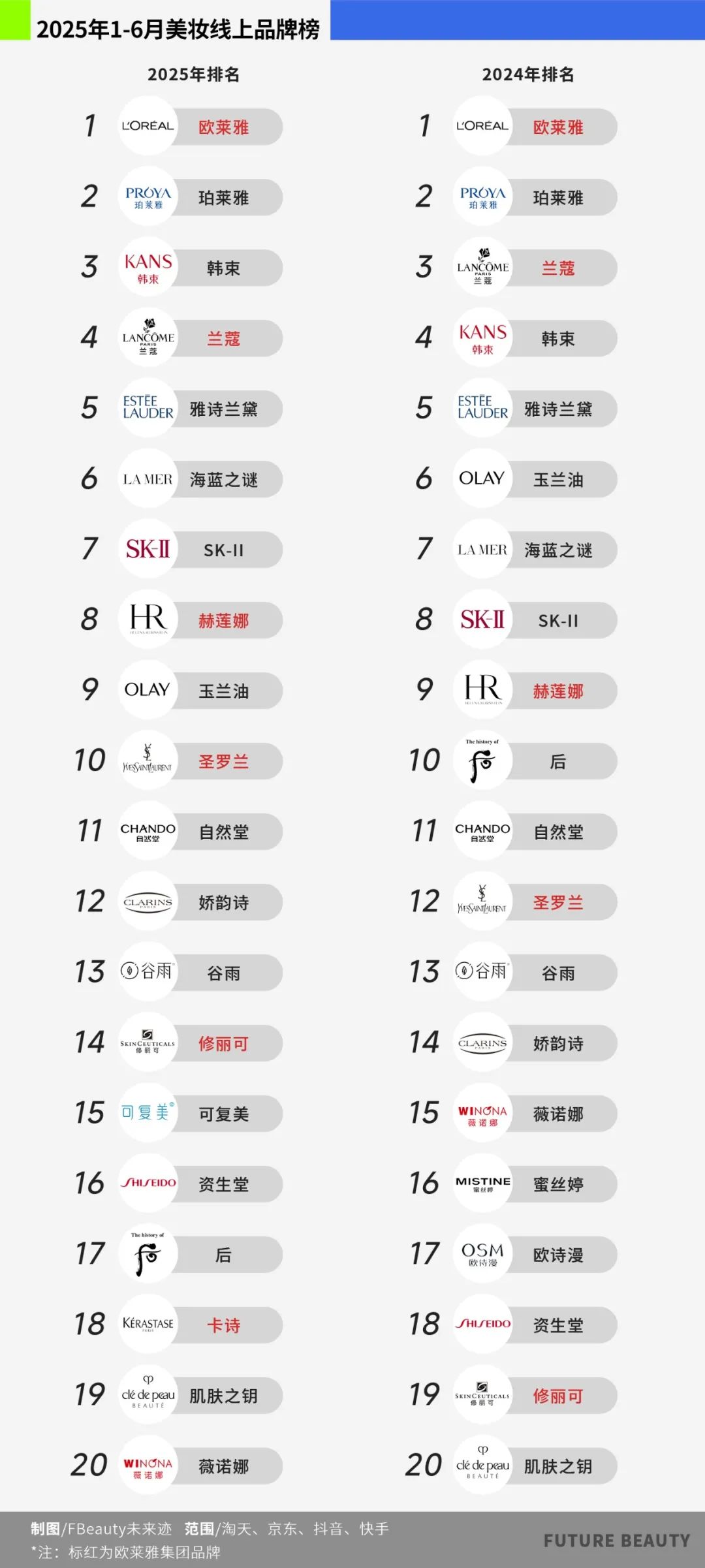 《FBeauty未来迹》结合淘天、京东、抖音、快手四大电商平台的上半年总体表现发现,在线上美妆榜TOP20中,欧莱雅集团的上榜品牌从2024年上半年的5席,上升至今年的6席。不仅欧莱雅稳站第一,赫莲娜、圣罗兰、修丽可均实现排位的上升,此外,卡诗作为细分赛道的“王者”,也成功闯入榜单。