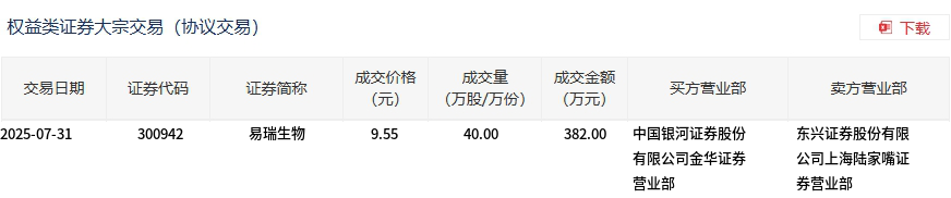 7月31日,易瑞生物大宗交易成交40万股,成交额382万元,占当日总成交额的2.63%,成交价9.55元,较市场收盘价11.23元折价14.96%。