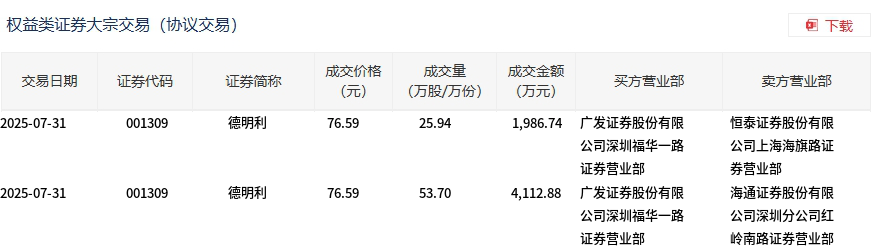7月31日,德明利大宗交易成交79.64万股,成交额6099.62万元,占当日总成交额的8.22%,成交价76.59元,较市场收盘价85.45元折价10.37%。