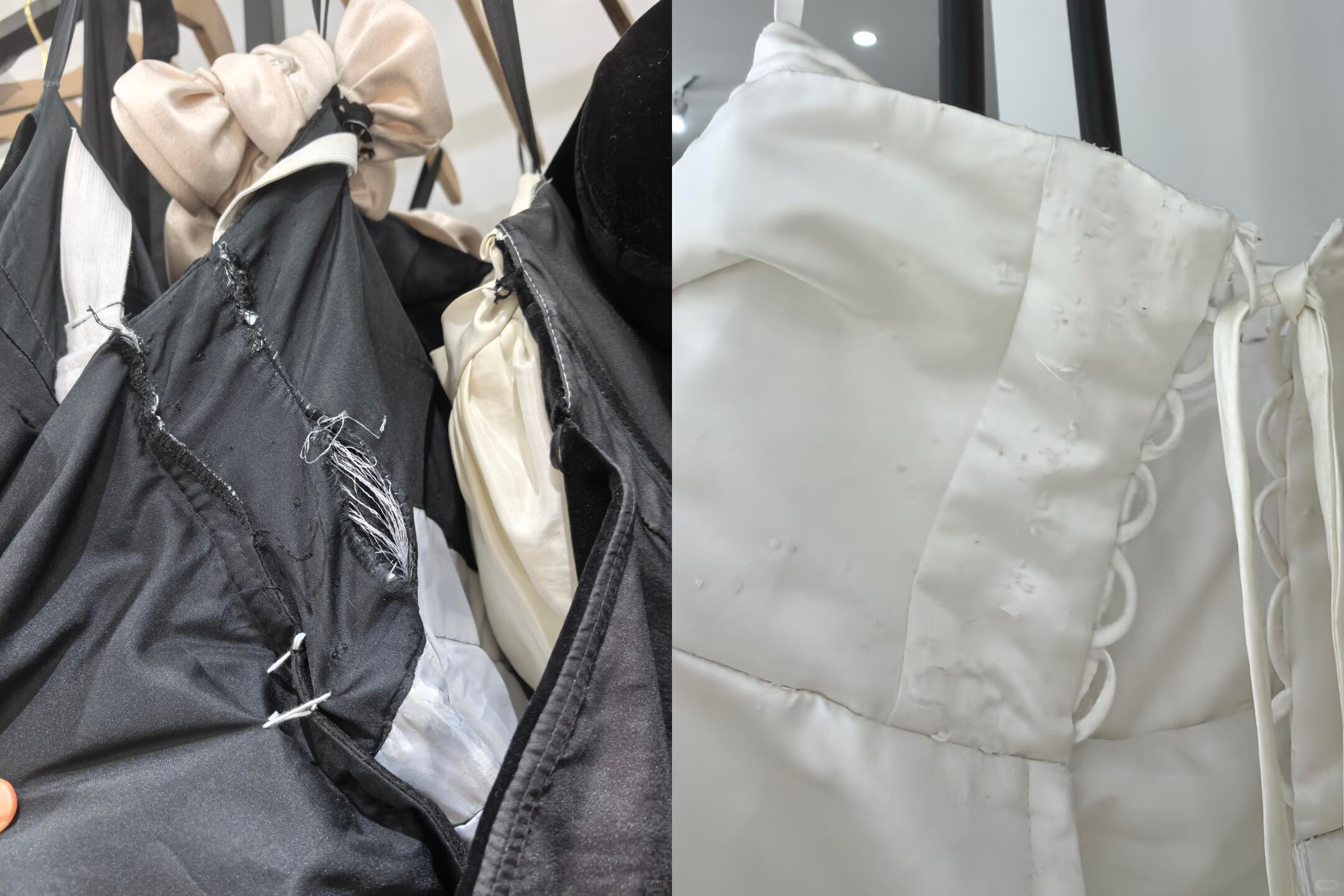但她还没放弃:“我来回开了这么久的车跑到这儿来,我肯定得拍。”勉强挑了2件上身试之后,没有任何质感、版型可言,“我甚至觉得花200块钱到网上买一件的质感都比他那个好”。衣服上原本应该向外展的花都向内缩了,拍照的时候根本看不见,工作人员只说可以去缝一下。