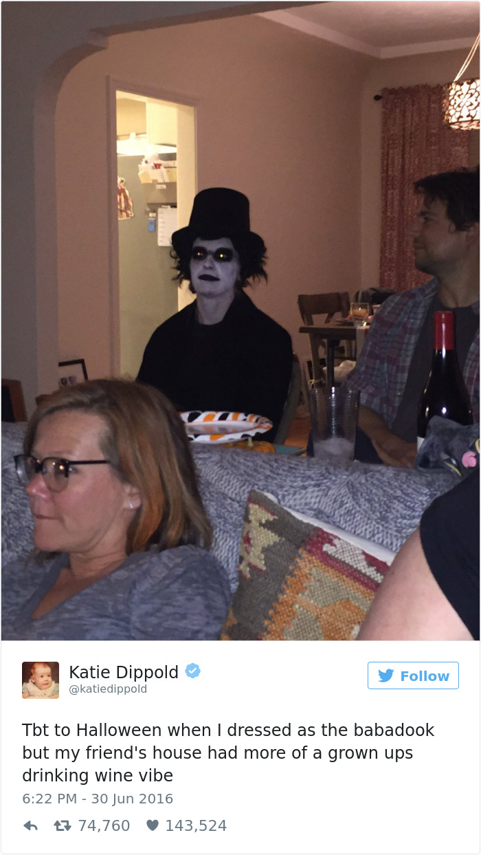 曾经有次万圣节,我打扮成babadook去我朋友家,结果我朋友家根本是一群大人聚在一起喝红酒的氛围。