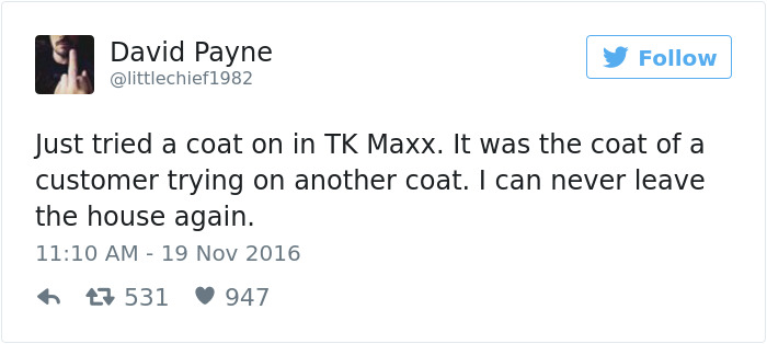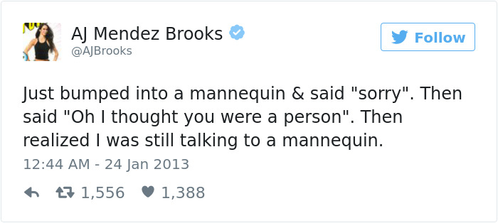 有次不小心撞到了一个假模特,我下意识就开始道歉。随后我发现后,紧接着说:“噢!我还以为你是个真人!”……但我为什么还在对他说话???