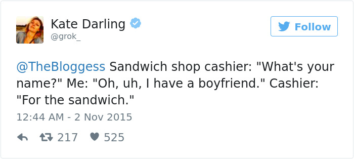 曾经在一家三明治店,收银员对我说:“你叫什么名字?”我:“额额⊙o⊙)…,我有男朋友了。”收银员回答说:“我是要在三明治上做个标记….”