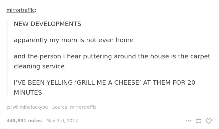 有一次我在家,我忘记我妈没在家。然后楼下是清洁地毯的正在工作,但是……我刚才一直在冲楼下喊了20分钟:“给我烤份奶酪。”