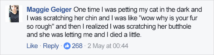 有一次我没开房间灯,坐在沙发跟我的猫咪玩耍。我挠着它的下巴,脑中想着:“怎么它的毛这么粗糙了?”结果没一会我才意识到我在挠他的菊花,它竟然还无动于衷…我当场立即阵亡了…
