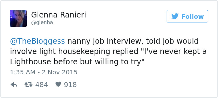 一次面试保姆工作,雇主告知我需要负责少部分的家务(light housekeeping)。我回答说:“我从没看管(keep)过灯塔(Lighthouse)诶!不过我愿意尝试!”