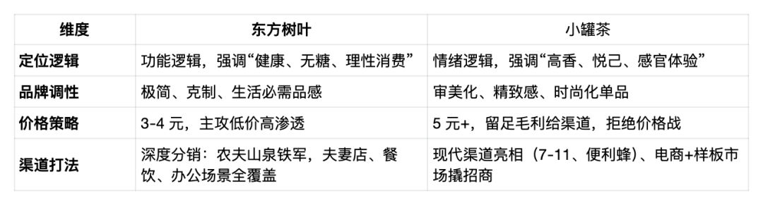 如果说东方树叶走的是 “功能逻辑+深度渠道”的渠道增长打法,而小罐茶走的是 “情绪逻辑+话题引爆”的品牌破圈路线,完全是两条参照系不同的轨道。