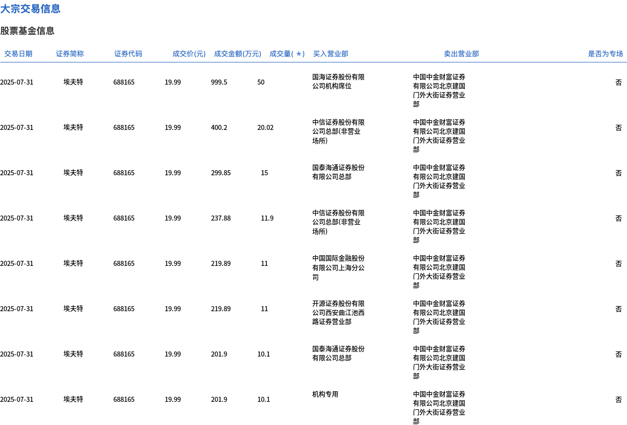 7月31日,埃夫特大宗交易成交139.12万股,成交额2781.01万元,占当日总成交额的10.44%,成交价19.99元,较市场收盘价23.45元折价14.75%。
