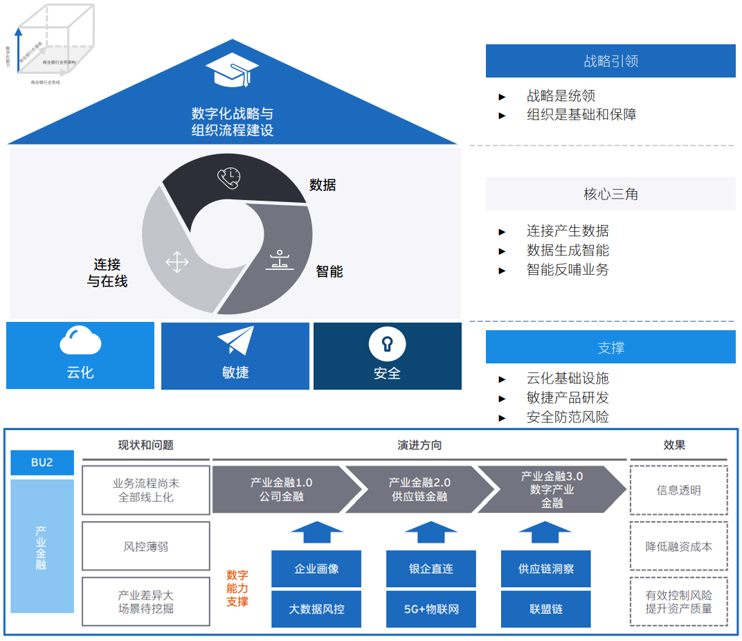 在产业金融方面,该行提出三阶段的演进方向,即公司金融、供应链金融和数字产业金融。