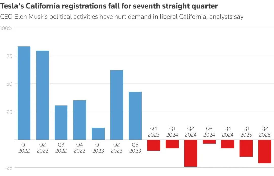 在美国市场,特斯拉的核心市场加州,交付量已经连续7个季度下滑,二季度更是暴跌21%,远超当地电动车市场13%的整体跌幅,后续还将面临电动车补贴到期的情况。在欧洲市场,马斯克的政治倾向也让特斯拉销量应声跌落,德国高达94%的消费者受访时明确表示拒买特斯拉。