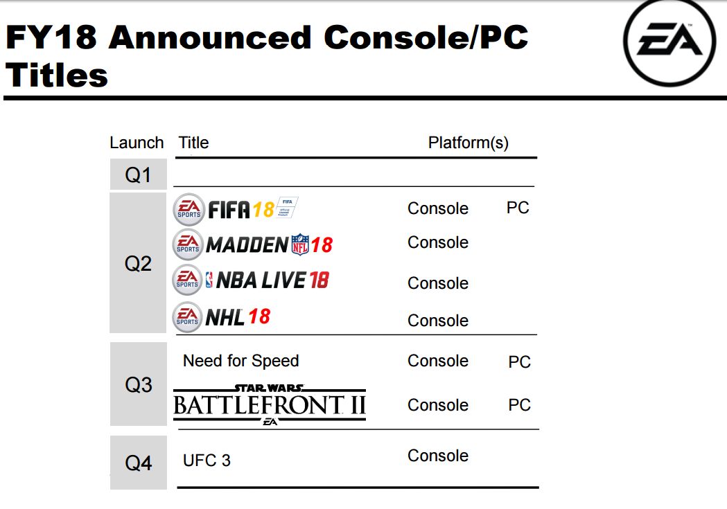 今年EA主打的游戏作品依然是那些“年货”,包括第二财季推出的《FIFA 18》和配合《星战》电影发售的射击游戏《星球大战:前线战场2》,《极品飞车》新作也将在2018年发售。该公司预计,2018财年其总营收将达到50.8亿美元,净利润约11.3亿美元。