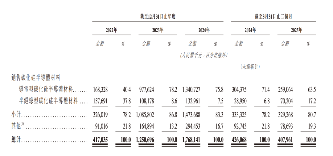 于往绩记录期间,天岳先进的收入主要来自销售导电型碳化硅半导体材料及半绝缘型碳化硅半导体材料。于2022年度、2023年度、2024年度、2025年截至3月31日止三个月,其销售碳化硅半导体材料贡献的营收占总营收的比重分别为78.2%、86.8%、83.3%、78.2%、80.7%。