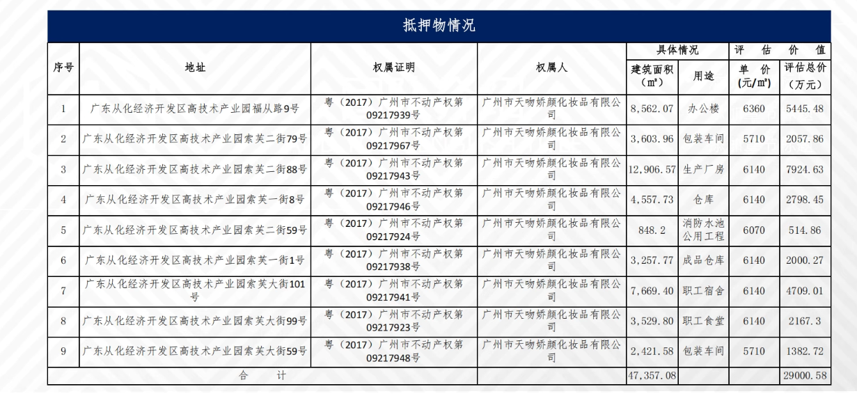 据招商公告显示,本次处置的债权包括贷款本金1.09亿元及相应利息、垫付费用。抵押物为天吻娇颜位于广州从化经济开发区高新技术产业园内的9处工业房产,经评估总价值达2.82亿元。