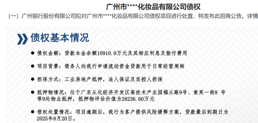 近日,青眼从阿里资产平台获悉,广州银行股份有限公司(下称“广州银行”)拟对广州市天吻娇颜化妆品有限公司(下称“天吻娇颜”)的债权项目进行公开招商处置。