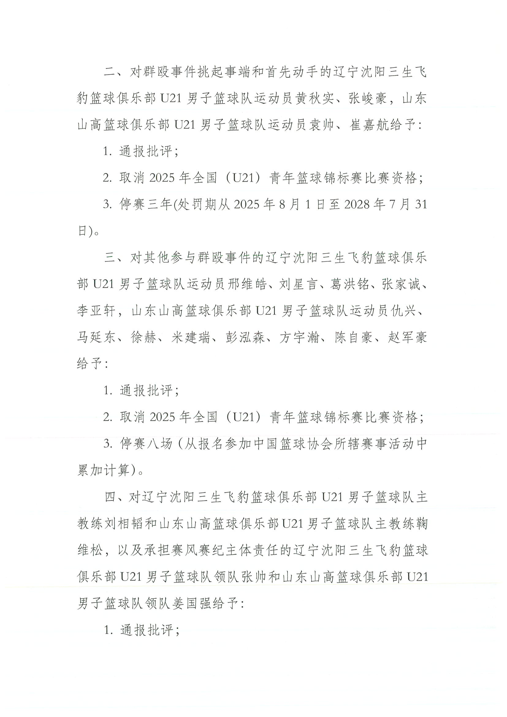 一是对辽宁沈阳三生飞豹篮球俱乐部U21男子篮球队、山东山高篮球俱乐部U21男子篮球队通报批评,同时取消2025年全国(U21)青年篮球锦标赛比赛资格及成绩。