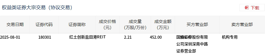 8月1日,红土创新盐田港REIT大宗交易成交452万股,成交额998.47万元,占当日总成交额的23.7%,成交价2.21元,较市场收盘价2.302元折价4%。