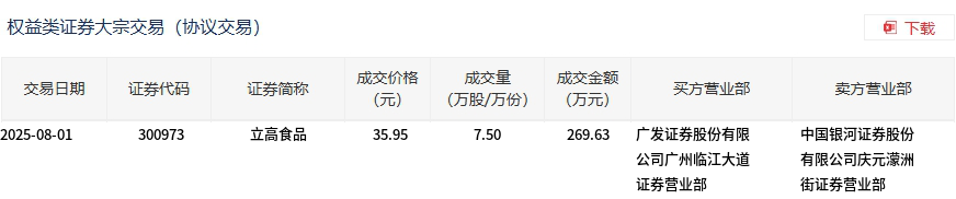 8月1日,立高食品大宗交易成交7.5万股,成交额269.63万元,占当日总成交额的2.91%,成交价35.95元,较市场收盘价44.11元折价18.5%。
