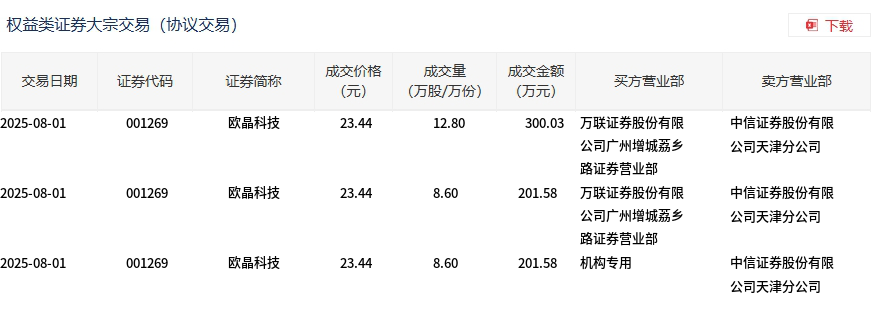 8月1日,欧晶科技大宗交易成交30万股,成交额703.19万元,占当日总成交额的4.04%,成交价23.44元,较市场收盘价26.81元折价12.57%。