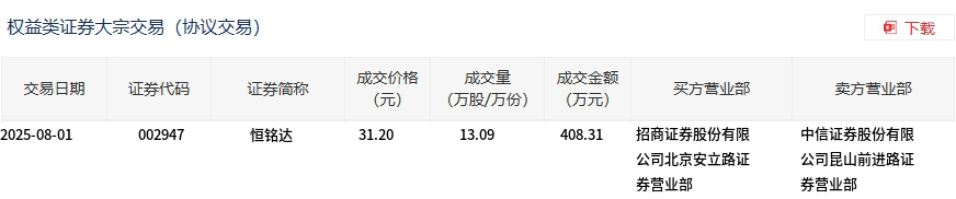 8月1日,恒铭达大宗交易成交13.09万股,成交额408.31万元,占当日总成交额的1.87%,成交价31.2元,较市场收盘价34元折价8.24%。