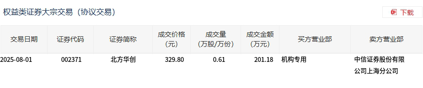 北方华创今日大宗交易平价成交6100股,成交额201.18万元