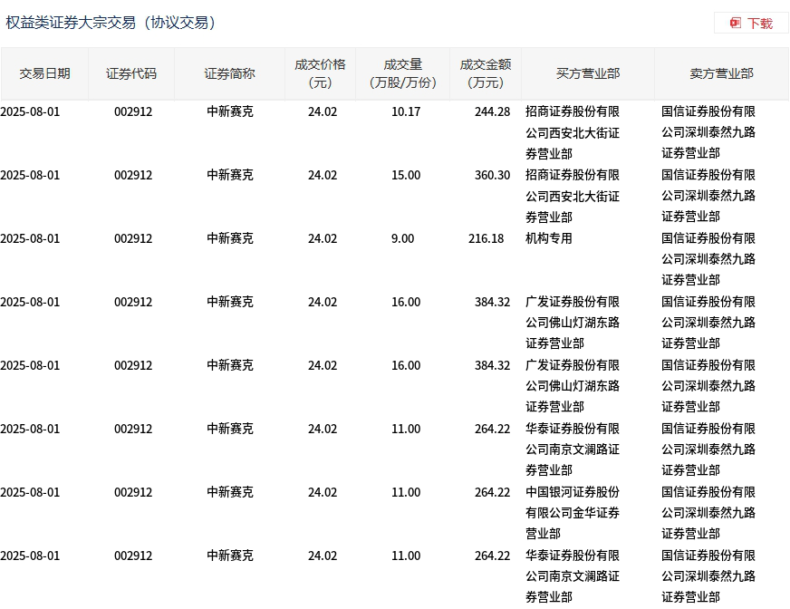 8月1日,中新赛克大宗交易成交99.17万股,成交额2382.06万元,占当日总成交额的11.13%,成交价24.02元,较市场收盘价27.33元折价12.11%。